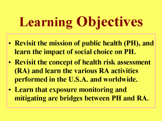 values and public concerns. The students are then asked to revisit the concept of RA and to learn the various RA tasks or activities that are ongoing today in the United States and worldwide. These example cases are provided to illustrate both the almost unlimited scope of health risks that can be assessed, and the different stages of RA that can be focused on by various health agencies. Finally, the students are to be taught that monitoring and mitigating human exposures are the ultimate bridges between PH and RA. RA is simply the means to an end in accomplishing PH mission. That is, to ensure that the risk at issue is at a socially acceptable level, the society or a community must mitigate the exposure of its population to the toxic agent to a safe level, and maintain the exposure at or below that level. |
