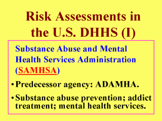 physiological risk factors. SAMHSA’s two other centers, the Centers for Substance Abuse Prevention and for Substance Abuse Treatment (formerly via National Institutes on Alcohol Abuse and Alcoholism and on Drug Abuse, which are now part of the National Institutes of Health), conduct RA through clinical, experimental, and epidemiologic studies aimed at improving knowledge of the effects and etiology of alcoholism and alcohol-related illness. These two centers also monitor clinical reports of drug abuse, conduct basic science investigations of the abuse potential of psychotherapeutic and psychoactive drugs, and determine the prevalence of drug abuse within the U.S. population. Some of the case studies that highlight the RA activities conducted within SAMHSA (more under ADAMHA) include: inborn schizophrenia; treatment of mood disorders with lithium; fetal alcohol syndrome; the misuse of phencyclidine; and the abuse of marijuana (U.S. DHHS, 1986). |
