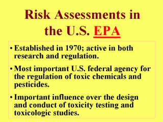 The Environmental Protection Agency (EPA) is the most important U.S. federal agency for the regulation of toxic chemicals. Formed in 1970, EPA is involved in both research and regulation. It is also responsible for the formulation of regulations authorized by several major legislative acts (as briefly discussed in Lecture 1), and the enforcement of those acts.