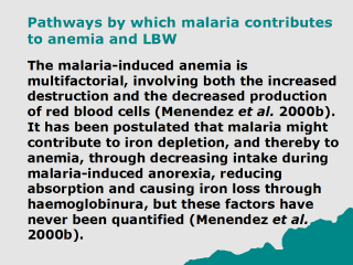 | Malaria is thought to reduce birth weight through a combination of systemic and localized effects. Firstly, malaria may affect birth weight through malaria-induced anemia. Secondly, malaria may reduce birth weight through placental infection (Menendez et al. 2000b). In the latter case, parasites either directly cause a mechanical compromise of placental circulation or indirectly interfere with placental functions and/or induce pathological lesions (Walter et al. 1982). |