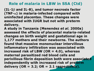 | Verhoeff et al. (2001) analyzing IUGR in rural Malawi studied 1,423 live-born singleton babies. Fifteen percent (14.9%) had a birth weight < 2500g; 17.3% were premature (< 37 weeks) and 20.3% had IUGR. Malaria at delivery was among the risks that were significantly associated with increased IUGR (RR = 1.4; 95% CI, 1.0 – 1.9), and prematurity risk was associated with primiparity (RR = 1.7; 95% CI, 1.3-2.4). |