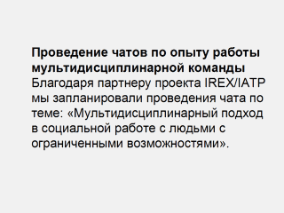 на базе региональных центров IREX/IATP в 25 регионах Украины: - государственные социальные службы (ЦССМ, Службы По Делам Несовершеннолетних, реабилитационные центры) - негосударственные организации (общественные организации, занимающиеся социальной адаптацией инвалидов, организации, работающие в мультидисциплинарном подходе) - представители Высших Учебных Заведений, имеющие факультеты по социальной работе и социальной психологии. Цель чата: обменяться опытом работ с организациями, работающими в мультидисциплинарном подходе. Ознакомить с деятельностью нашей команды. Презентовать деятельность нашей организации и нашего Интернет-портала. |