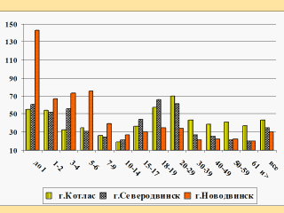 | Рис. 4. Возрастная структура заболеваемости болезнями мочеполовой системы в трех городах Архангельской области (оба пола, Медиана на 1000 ). |