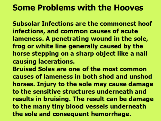 lameness. Treading on a stone is a common accident. The horse may become