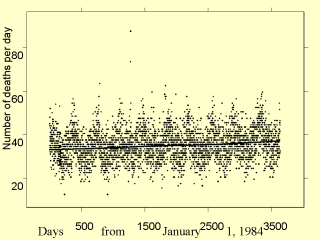 | The smooth line is a LOESS smoother that captures the long-term trend in the data. LOESS is similar to a moving average. Each data point is smoothed by considering the data points around it, and then an expected value for each data point is calculated based on these surrounding values. The level of smoothing depends, therefore, on the number of data points used. |