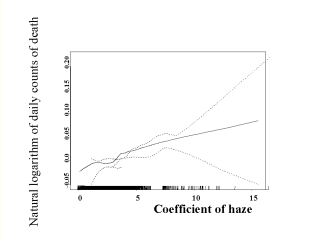 | The solid line is the best fitting dose-response curve; broken lines represent pointwise 95% confidence limits. The relative increase in daily mortality between any two levels of COH can be taken from the graph by subtracting the corresponding y-values and then exponentiating the difference. This provides an estimate of the mean change in daily counts of death per specified change in COH. |