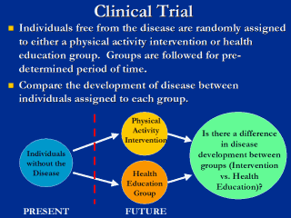 PROS: Random assignment of who does and does not receive the physical activity intervention minimizes potential biases. Data generated is prospective in nature and better than retrospectively obtained data which can be subject to participant recall bias. Just like the prospective design, a clinical trial can establish cause and effect. Investigators will be able to determine if physical inactivity lead to the disease or health outcome of interest. CONS: Expensive Not suitable for study of physical activity interventions to prevent diseases or outcomes that take a long time to develop or are rare. Individuals may behavior differently if they know they are being watched. This study is subject to participant dropout and loss to follow-up. Recommended Reading: Gordis L (2000). Epidemiology (2nd ed.). Philadelphia, PA: W.B. Saunders Company. |