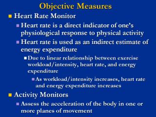 heart rate and energy expenditure and may lead to inaccurate results. Activity Monitors, often referred to as accelerometers, assess the acceleration of the body in a specific dimension (uniaxial) or multiple dimensions (triaxial). The monitors provide information on the intensity of acceleration at specified intervals. Following data collection, this information is downloaded to a computer for data processing. PROS. Objective measure of body movement that has been found to be valid in both laboratory and free-living settings. Activity monitors have the ability to provide information relating to intensity, frequency, and duration of physical activity. They are also non-invasive and have the ability to record over extended periods of time. CONS. They are costly and do not provide information concerning activity type. Also, the uniaxial monitors may be inaccurate during upper-body movements and during bicycling. Most activity monitors are not waterproof; therefore, water-based activities cannot be assessed. Also, improper monitor placement may lead to inaccurate results. Recommended Reading: Welk GJ (2002). Physical activity assessments for health-related research. Champaign, IL: Human Kinetics. |