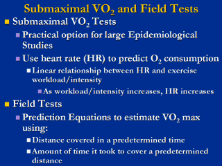Similarly, field tests use either the distance that is covered or the amount of time it took to cover a particular distance to estimate VO2 max using established prediction equations (ACSM, 2000) Recommended Readings: American College of Sports Medicine (2000). ACSM’s guidelines for exercise testing and prescription (6th ed.). Baltimore, MD: Lippincott Williams & Wilkins. |