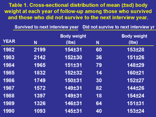 | Table 1 shows the cross-sectional distribution of body weight at each year of follow-up according to subjects who did and did not survive to the next interview year. There was no observable pattern of lower or higher body weight between these two groups over the follow-up that might suggest weight loss was secondary to disease and death. |