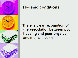 Housing conditions such as lack of safe play areas outside the home, overcrowding, are more likely to lead to unhealthy life styles, unhealthy diet, lack of exercise and depression, all of which can increase the prevalence of obesity.