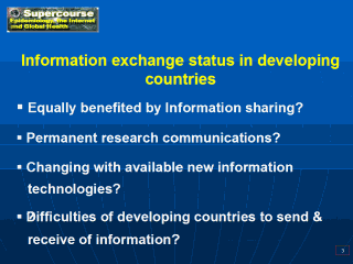 Information sharing must be like a double sided highway in which the scientists located at both sides can benefit equally. Why do research communications have to be "permanent"? Why shouldn't they change as new information technologies become available? Why should developing countries have difficulty sending and receiving information to the rest of the world? |