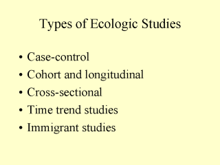 | Fairly sophisticated studies in which individual and grouped data are collected can be considered ecologic depending on whether 1) the exposure variable is measured ecologically and 2) whether it is an average for a geographic area. In Part-1, we considered the Harvard Six-Cities Study. If we assume that the measures of fine particles in each city, even though they were obtained from fixed- |