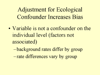 | In individual-level studies, adjustments for a true confounder will reduce bias. In this example, we will see that bias is actually increased. |