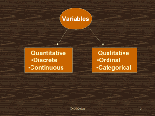 data:values that are numeric Qualitative data:values that can be placed into distinct categories according to some characteristics or attribute Discrete: assume value can be counted like number of brothers Continues:assume all values between any given two values like body temperature (your body temperature can be 36.7 but you can’t have 2.5 brothers) Ordinal:characterized in term of ranking from better to worse but the data are not measured in terms of continues scale like medical condition (mild, moderate, severe) Categorical: have no measurement scale like blood group(A, B, AB, O) |