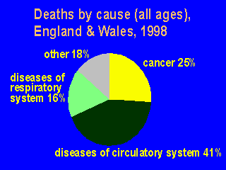 which has a population of 53 million. If 50% were over age 20 years, how would you expect this pie chart to change? (All mortality rates in this lecture were derived from the CD: Office for National Statistics. Twentieth Century Mortality. London: The Stationery Office, 1997.) |
