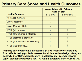 tobacco consumption. The stronger the primary care orientation in the country, the lower the all-cause mortality, all-cause premature mortality, and cause-specific mortality from asthma and bronchitis, emphysema and pneumonia, cardiovascular disease, and heart disease. Source: Macinko J, Starfield B, Shi L. The contribution of primary care systems to health outcomes within Organization for Economic Cooperation and Development (OECD) countries, 1970-1998. Health Serv Res 2003; 38(3):831-865. |