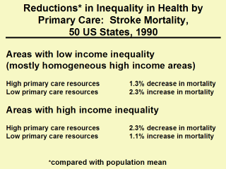 The positive effect on equity is shown in the case of stroke mortality. States with high income inequality and relatively high primary care physician to population ratios have lower stroke mortality whereas those relatively deprived of primary care physicians have an increased stroke mortality. States with low income inequality also show the same effect of high and low primary care resources: more primary care physicians associated with lower mortality and fewer primary care physicians associated with higher mortality.