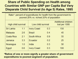 Sources: analyses from data in: Karolinska Institute. Global health chart, www.whc.ki.se/index.php, accessed September 29, 2004. Victora CG, Wagstaff A, Schellenberg JA, Gwatkin D, Claeson M, Habicht JP. Applying an equity lens to child health and mortality: more of the same is not enough. Lancet 2003; 362(9379):233-241. Castro-Leal F, Dayton J, Demery L, Mehra K. Public spending on health care in Africa: do the poor benefit? Bull World Health Organ 2000; 78(1):66-74. Carr D. Improving the Health of the World's Poorest People. Health Bulletin #1. Washington, DC: Population Health Bureau, 2004. |