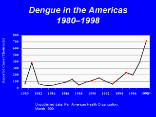 In the Americas, dengue fever intensified as a public health problem during the 1980s -- between 1980 and 1990 more than one million dengue cases were reported. Also, during those years, an increase in cases of the potentially fatal forms of dengue, dengue hemorrhagic fever and dengue shock syndrome, was observed in various countries of the Americas. Dengue is primarily an urban disease of the tropics, and the viruses that cause it are maintained in a cycle that involves humans and Aedes aegypti. One of four closely related, but antigenically distinct, virus serotypes, DEN-1, DEN-2, DEN-3, and DEN-4, of the genus Flavivirus, cause dengue and dengue hemorrhagic fever. Primary infection with any serotype may lead to acute illness defined as fever with two or more of the following symptoms: headache, bodily pain, rash, and hemorrhagic manifestations. Fever and other symptoms may subside after 3 or 4 days, and the patient may recover completely, or the fever may return with a rash within 1 to 3 days. Moreover, infection with one of these serotypes does not provide cross-protective immunity, so persons living in a dengue-endemic area can have four dengue infections during their lifetimes. Infection with a dengue virus serotype can produce a spectrum of clinical illness, ranging from a nonspecific viral syndrome to severe and fatal hemorrhagic disease. Secondary exposure to the same serotype generally does not produce illness because of pre-existing antibodies. However, secondary exposure to a different serotype may lead to another dengue fever episode, and the patient may be at risk for more serious forms of infection, dengue hemorrhagic fever or dengue shock syndrome. Furthermore, dengue virus infection may also cause a nonspecific febrile illness that can be easily confused with measles or influenza. Therefore, a proper laboratory test is essential for a correct differential diagnosis and to public health surveillance reporting. |