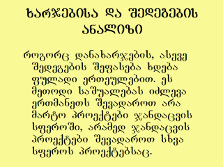 Cost-benefit analysis. qarTul ekonomikur leqsikonSi es meTodi moxsenebulia rogorc "danaxarjebisa da Sedegebis analizi", magram iqve aRniSnulia, rom danaxarjebi igive xarjebia. qal. r. asaTianis wignSi aris "xarjebisa da Sedegebis analizi". bat. g. xeCinaSvili iyenebs termins "xarjT-sarfianobis analizi". am terminis rusuli Sesatyvisia Анализ выгодности затрат (mTar. SeniSvna).