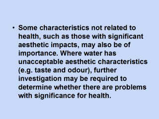 The plans should address all aspects of the water supply and focus on the control of water production, treatment and delivery of drinking-water. The control of microbial and chemical quality of drinking-water requires the development of WSPs which, when implemented, provide the basis for system protection and process control to ensure that numbers of pathogens and concentrations of chemical present a negligible risk to public health. Many drinking-water supplies provide adequate, safe, drinking-water in the absence of formalised WSPs. A major benefit of developing and implementing a WSP for these supplies is the systematic and detailed assessment and prioritisation of hazards and the operational monitoring of barriers or control measures. This process ensures that safe water is continually supplied and that contingency plans are in place to respond to system failures or hazardous events. Health-based targets Health-based targets provide the basis for the application of the Guidelines to all types of water supply. Constituents of drinking-water may cause adverse health effects from either single (e.g. microbial pathogens) or long-term exposures (e.g.non-threshold genotoxic chemicals) or longer-term or multiple exposures (in the case of chemicals which have a threshold of effect). Due to the range of constituents in water, their mode of action, and nature of fluctuations of concentrations in drinking-water, there are four principal types of health-based targets used as the final requirement for safety of drinking-water all based on Health outcome targets: Health outcome targets: In some circumstances, especially where there is a measurable burden of disease, a significant proportion of which is water-related/water-borne, reducing exposure through drinking-water has the potential to appreciably reduce overall risks of disease. In such circumstances it is possible to establish a health-based target in terms of a quantifiable reduction in the overall level of disease. This is most applicable where adverse effects soon follow exposure and are readily and reliably monitored and where changes in exposure can also be monitored readily and reliably. This type of health outcome targets is therefore primarily applicable to some microbial hazards in developing countries and chemical hazards with clearly-defined health effects largely attributable to water (e.g. fluroride). In other circumstances health-based targets may be the basis for evaluation of results of quantitative risk assessment models. In these cases, health outcomes are estimated based on information concerning exposure and dose-response relationships. The results may be employed directly, as a basis to define water quality targets or provide the basis for development of performance and safety targets. Such an approach is currently of limited napplicabilty in practice because of limitations in the available data and models. Specific attention must be given to short term fluctuations in water quality that may be sporadic in nature but may be determining for overall health risks or even the cause of outbreaks. Water quality targets (WQTs) are established for individual drinking-water constituents which represent a health risk from long-term exposure and where fluctuations in concentration are small or occur over long periods. They are typically expressed as Guideline Values (concentrations) of the substances of concern. Performance and safety targets: control measures employed as part of the drinking-water management system for constituents where short-term exposure represents a public health risk, or where large fluctuation in numbers or concentration occur over short periods of time with significant health implications. They are typically expressed in terms of required reductions of the substance of concern or effectiveness in preventing contamination. Directly specified requirements: National regulatory agencies may establish targets for specific actions for smaller municipal and community water supplier. Such targets may identify specific permissable devices or process for given situations and generic drinking water system types. |