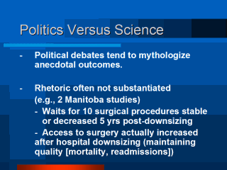 How do we want policy decisions to be steered in Canada (or the US)? By the mere ebb and flow of political tides (interests of politically influential groups)? Or By systematic evidence derived from rational and empirical enquiry (science)? Manitoban studies referred to in slide: DeCoster et al., Med Care 1999 Brownell et al., Med Care 1999 |