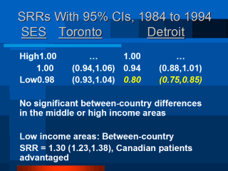 survival rate ratio. The slide depicts the lack of a significant income gradient in Toronto and a significant one in Detroit (low/high income survival rate ratio of 0.80). And, as hypothesized, a significant country by income interaction was observed (the effect of country was moderated by income level). A Canadian advantaged was observed in the lowest third of income areas (survival rate ratio = 1.30), but not in the other middle to high income areas. And given the relative commonness of breast cancer such SRRs (reflecting a 20-30% risk ratio) may be thought of as very large in a population attributable risk sense. |