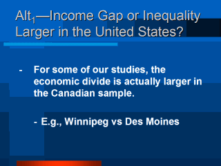 For example, it could be advanced that the economic divide is, in fact, wider in the US than in Canada, and that it is some social-health phenomena of such relative inequality in the US, rather than any absolute effect of being poor/uninsured, that is responsible for the observed US survival disadvantage. However, it was clearly observed that such is not always the case. The income distributions displayed in slide 17, for example, clearly show a wider economic divide in Winnipeg than in Des Moines. Yet, cancer patients in Winnipeg remained advantaged. |