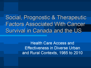 A study on breast cancer is already funded: Canadian Institutes of Health Research/Canadian Breast Cancer Research Alliance, 2004-9, $374,000. A study on colon cancer is presently under review: National Cancer Institute of Canada, $293,050. Breast and colon cancer have been selected for their public health significance (commonness, preventive potential: early diagnosis and access to the best treatments with effective follow-up matter), and for their previously observed social gradients in some international contexts. Also, increasingly effective treatments were introduced over this study’s generational time frame for all stages of both breast and colon cancer. They therefore have scientific and clinical power to expose any within- or between-country social gradients, if they exist. They also offer an interesting contrast, in that breast cancer screens are already common practice, while such screens for colon cancer will probably become much more common practice over the next 5 years or so. And high quality primary care may be thought of as a screen of sorts for both breast and colon cancer. |