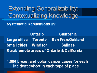 populations greater than 4 million. Smaller cities and their surrounding county environs have populations between 300,000 and 400,000. Rural places are communities of less than 10,000 residents with population densities of less than 150 per km2. Remote places are typically removed from urban centres by 200 miles or more (Health Canada’s Rural Health Initiative definitions). Ontarian and Californian sampling frames were selected for the high quality of their cancer registry databases as well as for their representation of diverse Canadian and American places. |