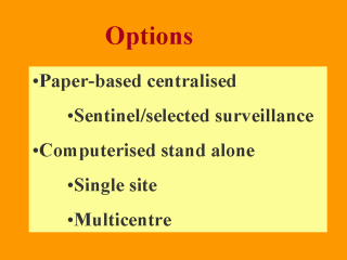 options when setting up health information systems are: 1) Paper-based centralised, scannable or manual entry forms: useful in developing settings or in places with no intention of becoming computerised.Example, a GP-based sentinel surveillance system. Advantages: simple, quick, easy to use and interpret. Disadvantages: time consuming, uses room, papers could be lost, quality of information could be doubtful and needs contrl by telephone or fax, obsolete. 2) Computerised stand-alone system: useful when the scope of the system is small and the size of the data set or the skills of the data manager are limited. Example: a hospital-specific database on staff exposure to meningococcal meningitis and access to post-exposure prophylaxis. Advantages: easy to maintain, information easy to process, easy to protect information. Disadvantages: limited capacity and reduced opportunity for a comprehensive data base; need to keep back-ups in case of damage to the single computer, loss of confidentiality if kept in a network. 3) Computerised Multicenter: e-mail based batches of data sent weekly toi central location for data processing. Example: minimum data set held at all sexual health clinics around a State. |