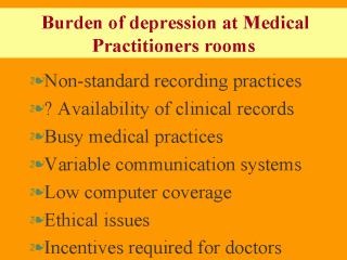 scenario: You are asked to recommend a way to measure the burden of disease of clinical depression at doctors consultation rooms. Medical practitioners do not have standard record practices and if you are lucky, you will find incomplete medical paper records. As you know, the number of patients is high so doctors do not have a lot of time to process additional requests for information. In general there is a low degree of computerisation in these medical practices and some doctors prefer good old fax or telephone. There are obviously ethical issues about sharing or transferring data on this sensitive issue (potential for discrimination of patients by employers) and medicos want to be paid for any form they are asked to fill in in addition to their routine practice. What is your best bet? |