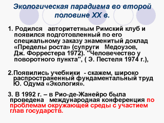 5. В СССР обсуждались проблемы экологического кризиса современной цивилизации, в свете взаимоотношений природной, технической и социальной систем (М. М. Будыко, Н. Н. Моисеев, Е. К. Фёдоров, И. Т. Фролов, С. С. Шварц и др.). [1] Реймерс Н.Ф. Природопользование. М., 1990. С.593. |