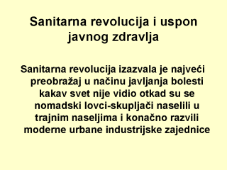 Sanitarna revolucija u 19. veku izrasla je iz Snouovog (Snow) otkrića potpomognutog radovima ostalih: Viliama Fara (William Farr), lekara i vitalnog statističara, prvog kompilatora sažetaka u novostvorenoj kancelariji Engleskog opšteg registra; bakteriologa Luj Pastera (Louis Pasteur) i Roberta Koha (Robert Koch); patologa-sanitarca Rudolfa Virhofa (Rudolph Virchow); socijalnih reformatora i ranih specijalista javnog zdravlja Edvina Čadvika (Edwina Chadwicka), Lemuela Šatuka (Lemuela Shattucka), Džona Simona (John Simon), a ubrzo i bataljona drugih. Ljudska naselja bila su kolevke civilizacija, ali u odsustvu odgovarajuće higijene i sanitacije bile su, takođe, i rasadnici pošasti i bolesti. Gradovi 19. veka bili su opasna mesta koja su obilovala bolestima i preranim smrtima. Više od četvrtine sve živorođene dece umiralo je u prvoj godini života, a polovina ih je umirala pre nego što su bili dovoljno stari da dobiju sopstvenu decu. Deca su umirala od gastrointestinalnih i respiratornih infekcija: kolere, tifusa, dečjeg proliva, difterije, krupa, malih boginja, zapaljenja pluća, tuberkuloze. Autor slajda: Džon last (John Last), Canada http://www.pitt.edu/~super1/lecture/lec2561.htm *Napomena: sanitarna revolucija odnosi se na promene u javnozdrastvenoj praksi i navikama u Severnoj Americi i Evropi krajem 19. veka. |