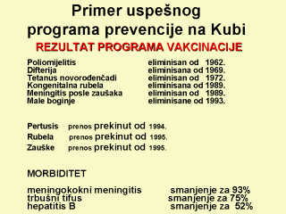Zdravstveni sistem Kube je besplatan i svima dostupan sa jakim naglaskom na prevenciju i razmenu informacija. Kuba je u nekoliko poslednjih decenija postigla značajno produženje očekivanog životnog veka i značajno smanjenje maternalnog mortaliteta i mortaliteta odojčadi. Gotovo sva ta dostignuća mogu se pripisati preventivnim aktivnostima. Ovaj slajd pokazuje uspehe programa vakcinisanja na Kubi. Slična dostignuća mogu se zapaziti u mnogim drugim zemljama, uključujući Švedsku, Finsku i neke delove Indije. Jasno je da u poslednjoj polovini 20. veka u većini zemalja prevencija još uvek ima snažan pozitivan uticaj. Autor: Peter G. Bourne, Kuba Javno zdravlje na Kubi |