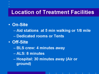 | Some large events will require on-site medical posts; these should be prepared to cater to the needs of the crowd attending the event. Basic and advanced life support ambulances should be allocated on the basis of an optimal response time. |