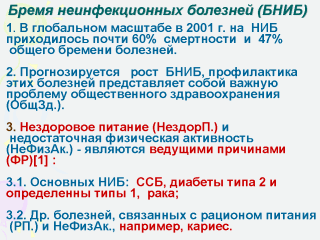5. Быстрые изменения в РП и степени физической активности (ФАк) еще более способствуют повышению показателей заболеваемости, смертности. 6. Курение также повышает риск всех этих болезней!7. В развивающихся странах все в большей степени наблюдаются негативная динамика избыточного питания и излишнего веса [2].[1] Доклад о состоянии здравоохранения в мире, 2002 г.. Уменьшение риска, содействие здоровому образу жизни. Женева, Всемирная организация здравоохранения, 2002 г. [2] Глобальная стратегия ВОЗ в области рациона питания, физической активности и здоровья (утверждена Всемирной ассамблеи здравоохранения, резолюция 57.17 от 22 мая 2004 года) |