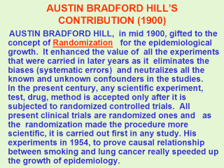 | Another major contribution is his check-list to judge the causality of association. which rightly helped several epidemiologists of later periods to decide about the causal association. |