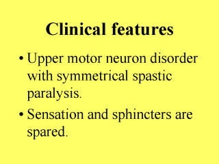 the lower limbs. Patients have difficulty in walking with exaggerated deep tendon reflexes and clonus. Patients walk with a typical adductor gait with or without walking cane. Weakness and heaviness in lower limbs. |