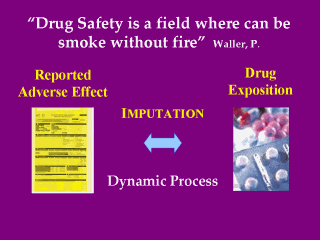 | One of the most difficult components of safety monitoring is the causality assessment of reported adverse events, named "imputation". Imputation does not prove a causal relation. It's a dynamic process of causal inference thorough continuous assessment of information considered on the differential diagnose of an adverse drug reaction. |