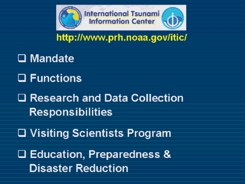 | "ITIC Mandate ITIC's mandate and functions evolved and expanded over the years. Initially, ITIC was given the general mandate of mitigating the effects of Tsunamis throughout the Pacific by supporting Member States of the ICG/ITSU in developing and improving preparedness for tsunamis by monitoring and seeking to improve the Tsunami Warning System for the Pacific; by gathering and disseminating knowledge on tsunamis, and fostering tsunami research; by bringing a knowledge of the Tsunami Warning System and ITIC to non-member states, and information on how to become participants through ICG/ITSU; and by conducting post-disaster surveys for the purpose of documentation and understanding of the tsunami disaster. Later, the functions and responsibilities of ITIC were expanded to include a number of other tsunami disaster preparedness and education activities, aimed at disaster reduction. ITIC Functions Additional ITIC functions include: a) Insuring the dissemination of tsunami watches and warnings and the collection of tsunami information on a real-time basis; b) Giving technical advice on the equipment required for an effective warning system and providing assistance in the establishment of national warning systems; c) Making periodic studies and assessment visits to developing countries in order to evaluate their instrumentation requirements, assess their performance, offer advice as appropriate, and suggest avenues for assistance; d) Evaluating the performance of the Tsunami Warning System with regard to communications, data networks, and the dissemination of warnings; e) Coordinating the development of the observing system which provides the information necessary for the issuance of effective tsunami warnings to those nations wishing to receive such messages. Research and Data Collection Responsibilities ITIC maintains a complete library of publications related to tsunamis. The Centre also maintains a full file of data related to tsunamis as obtained from WDC's and from the real-time Tsunami Warning System, to serve as part of the basis for the information services, materials for visiting scientists, and data compilations and summaries. To accomplish this task, ITIC maintains close contact with IUGG (International Union Of Geodesy and Geophysics) and many other national and international scientific organizations. ITIC continuously monitors the results of current tsunami research in order to find applications which may result in the improvement of the International Tsunami Warning System. Visiting Scientists Program One of the most successful ITIC programs has been the Visiting Scientists Program. With Member States' and UNESCO/IOC support, ITIC conducts this training program by providing facilities at the Centre and by arranging for the exchange of scientists among UNESCO/IOC member countries. ITIC has trained numerous scientists of Member States who, upon returning to their respective countries, train and educate others on tsunami programs and procedures, thus ensuring the continuity and success of the program. Education, Preparedness and Disaster Reduction. With Member States' and UNESCO/IOC support, ITIC organizes and conducts scientific workshops and educational seminars aimed towards tsunami disaster education and preparedness. These training workshops are usually conducted in conjunction with IOC/ITSU meetings which are held every two years in a member state for the purpose of coordinating and reviewing the activities of the International Tsunami Warning System (ITWS)." Citation source: http://www.drgeorgepc.com/TsunamiFAQ.html |