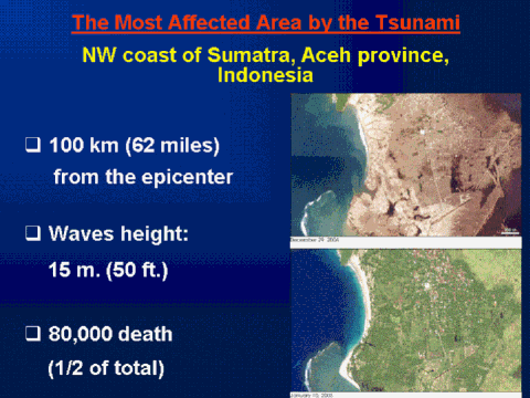 center. Almost all the trees, vegetation, and buildings in the area were washed away. Behind the town, low-lying agricultural areas remained covered with water 4 days after the disaster, and sand on the nearby beaches was completely removed." Pictures: Lhoknga before (lower) and after (top) the earthquake and Tsunami. Citation source: http://earthobservatory.nasa.gov/NaturalHazards/ |
