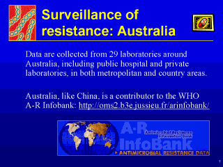 So what is the status of antibiotic resistance today? Like many other countries, Australia maintains a network of surveillance laboratories. We also feed data into the newly developing WHO antimicrobial resistance databank |