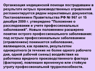 Постановлением определено, что при установлении предварительного диагноза - острого профессионального заболевания (отравления) учреждение здравоохранения обязано в течение суток направить экстренное извещение о профессиональном заболевании работника в центр государственного санитарно-эпидемиологического надзора, осуществляющий надзор за объектом, на котором возникло профессиональное заболевание и сообщение работодателю по форме, установленной МЗ РФ. ЦГСЭН, получивший экстренное извещение, в течение суток со дня его получения приступает к выяснению обстоятельств и причин возникновения заболевания, по выяснении которых составляет санитарно-гигиеническую характеристику условий труда работника и направляет ее в государственное или муниципальное учреждение здравоохранения по месту жительства или по месту прикрепления работника. |