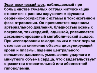 I. Критическое состояние для возникновения шока (предшок). II. Начальный шок. III. Развитый шок. Степени тяжести шока: I ст. - обусловлена пороговыми или критическими концентрациями химического вещества, вызвавшего отравление. Сознание больных чаще сохранено (при отравлении снотворными препаратами - отсутствует), пострадавшие возбуждены или заторможены. Пульс слабого наполнения, частый; АД не ниже 90 мм рт.ст. Умеренная олигурия (до 20 мл/ч). Интенсивная противошоковая терапия в течение 6 ч дает положительный эффект. II ст. - обусловлена критическими концентрациями токсического вещества в организме. Сознание может быть сохранено, но больные резко заторможены, адинамичны. Отмечаются бледность и акроцианоз, выраженная одышка, тахикардия, олигурия (менее 20 мл/ч), АД ниже 90мм рт.ст. Тенденция к восстановлению параметров гемодинамики наблюдается спустя 6-12 ч и более на фоне противошоковых мероприятий. III ст. - обусловлена критическими или смертельными концентрациями химического вещества, вызвавшего отравление. Несмотря на интенсивную противошоковую терапию в течение 6-12 ч, положительная динамика либо отсутствует, либо оказывается нестойкой. IV ст. - необратимая. В подобных случаях необходимо введение плазмозамещающих жидкостей (полиглюкин, реополиглюкин), кристаллоиды, 10-15% р-р глюкозы с инсулином в/в капельно до восстановления ОЦК и нормализации гемодинамических показателей. Обычно требуется 2-3 л растворов, вводимых со скоростью 750-1000 мл/час. В дальнейшем проводится поддерживающая инфузионная терапия со скоростью 300-500 мл/час. Одновременно проводится гормональная терапия (преднизолон до 500-800 мг/сут в/в). Чрезычайно важна инотропная поддержка симпатомиметическими средствами (норадреналин, допамин, дофамин, добутрекс). При метаболическом ацидозе вводят р-ра натрия гидрокарбоната 4% - 400,0 и больше. При отравлении прижигающими ядами (кислоты и щелочи) необходимо купировать болевой синдром введением глюкозо-новокаиновой смеси (р-ра глюкозы 5% - 500,0 и р-ра новокаина 2% - 50,0 в/в), наркотических анальгетиков и нейролептанальгезией. Кардиогенный отек легких возникает при левожелудочковой недостаточности, гипергидратации, отравлении кардиотоксическими ядами, хлорохином, колхицином. |
