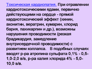 Острые дистрофические поражения миокарда относятся к более поздним проявлениям отравлений и выражены тем отчетливее, чем длительнее и тяжелее протекает интоксикация. На ЭКГ выявляются изменения фазы реполяризации. В комплексной терапии острой токсической дистрофии миокарда следует использовать лекарственные препараты, улучшающие обменные процессы (витамины группы В, кокарбоксилаза, АТФ и др.). |