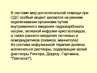 Продолжается адекватное обезболивание. Для обезболивания в случаях раздавливания нижних конечностей, поясничной области, таза хорошо зарекомендовала себя эпидуральная анальгезия. Когда ответ на стимуляцию диуреза отсутствует, повторно назначать лазикс или маннитол не следует. |