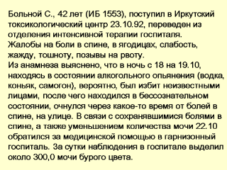 Лабораторные данные в дни пребывания в стационаре: в крови - эритр. 3,8х10 12 /л, лейк. 5,7х109/л, сегм. 88, лимф. 9, мон. 3%, СОЭ 10 мм/час, креатинин 3,5-8 -6,4 мг% , сахар 4,9 ммоль/л, кальций 1,9 ммоль/л, хлориды 100 ммоль/л, калий 4,1- 4,4 ммоль/л, натрий 117 ммоль/л, гематокрит 46%, билирубин 23,5 мкм/л, непрямой 18 мкм/л; в моче: цвет от бурого до соломенно-желтого, белок от 9,9 - 1,8 - 1,1 до 0,075 г/л, эритроциты от свежих в большом количество до 2-3 в п.зр., цилиндры гиалиновые, зернистые 3-8, восковидные единичные, гемосидерин в небольшом количестве. Назначено лечение: Диета 7, 2% р-р промедола - 1,0 п/к, глюкозо-новокаиновая смесь - 200,0; 5% р-р дофамина - 10,0 в 0,9 р-ре хлорида натрия, 2,4% р-р эуфиллина -10,0 в 40% р-ре глюкозы, 20% р-р глюкозы - 200,0 с инсулином и 5% р-ром аскорбиновой к-ты 0,9% р-р натрия хлорида - 400,0; 5% р-р глюкозы - 400,0; 4% р-р натрия бикарбоната - 200,0; 1% р-р кальция хлорида - 200,0; лазикс 100 мг, феноболил однократно, р-ры дибазола, папаверина, прозерина, парафин на область почек. В результате проведенного лечения состояние больного заметно улучшилось: исчезли боли в спине, слабость, тошнота, жажда, одышка. Диурез к концу первых суток пребывания в отделении составил 500,0; вторых суток - 1000,0; третьих - 1500 мл, в дальнейшем диурез не измерялся. Через 9 суток, в состоянии близком к удовлетворительному, больной самовольно покинул отделение. Приведенные клинические наблюдения демонстрируют многообразие форм позиционной компрессии тканей, приводящей к развитию острой почечной недостаточности. Отягощающими факторами в обоих случаях было длительное переохлаждение в состоянии алкогольной комы. Объем сдавления определял тактику лечения (активная экстракорпоральная детоксикация и усиление естественной детоксикации). Для обоих пациентов характерна неадекватная оценка случившегося с ними. |