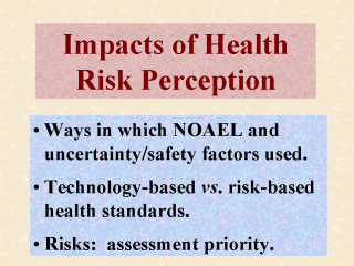 difference, intraspecies sensitivity, and data quality. The concerns with adverse health effects also vary greatly among health statutes and hence among regulatory agencies. In the United States, for example, health statutes similar to the Clean Air Act require risk-based standards to protect human health by providing an ample margin of safety. Yet other health statutes like the Clean Water Act impose regulations that are based on the best available technology. It is important to note that in reference to the chart provided in Slide 6, certain toxic agents like pesticides, asbestos, nuclear power are listed under the uncontrollable and not observable group. This group typically receives higher or highest priority in regulatory risk assessment, whereas smoking, handguns and other societal problems have lower priorities as they are put under the controllable and observable category. |